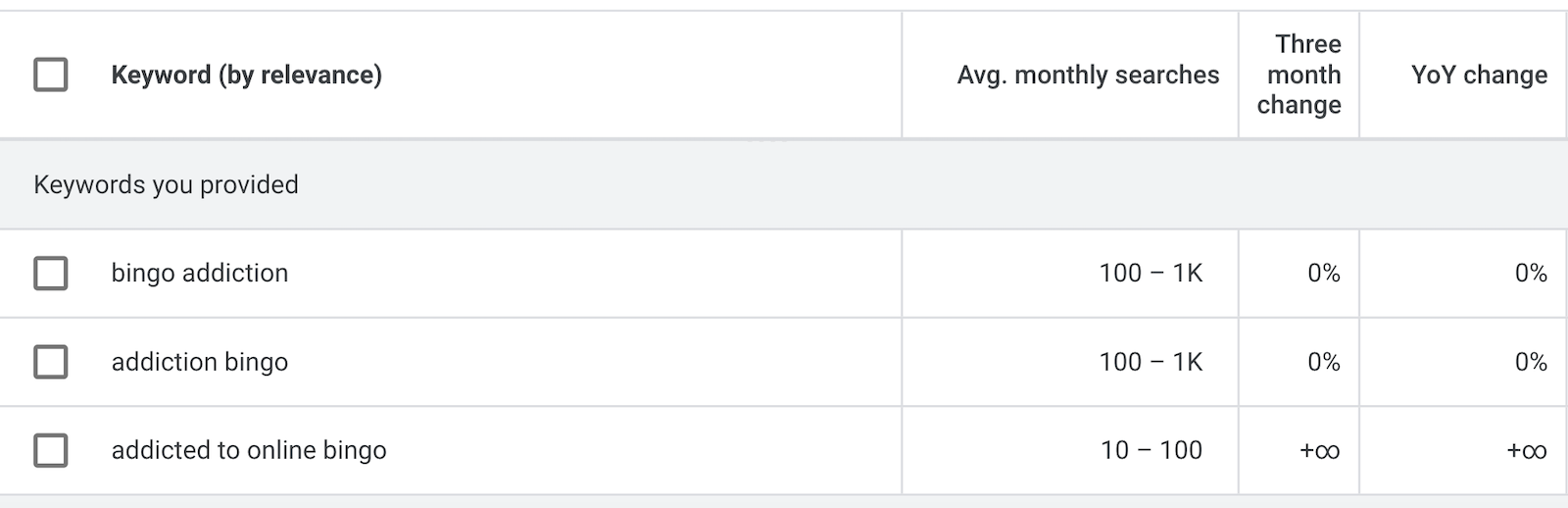 Up to 1000 individuals per month per the most populated U.S. states are searching for information relating to bingo addiction, while the “addicted to online bingo” query is experiencing year-over-year and 3-month growth of “+ ∞” (positive infinity) which indicates a significant-to-extremely high positive growth in search volume.
