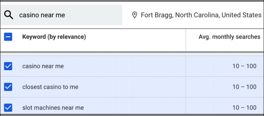 The above data is a mere snippet of the search volume occurring for land-based casinos near Fort Bragg/Liberty. At press, the population of the base consists of 43,414 Active-Duty Soldiers, 1,648 Reserve Component, 1,927 Temporary Duty Students and Trainees Military, 27,005 Army retirees, and 62,962 and Active-duty family members. In addition to the above search expressions, this small pocket of population is typing the following into their search browsers each month: