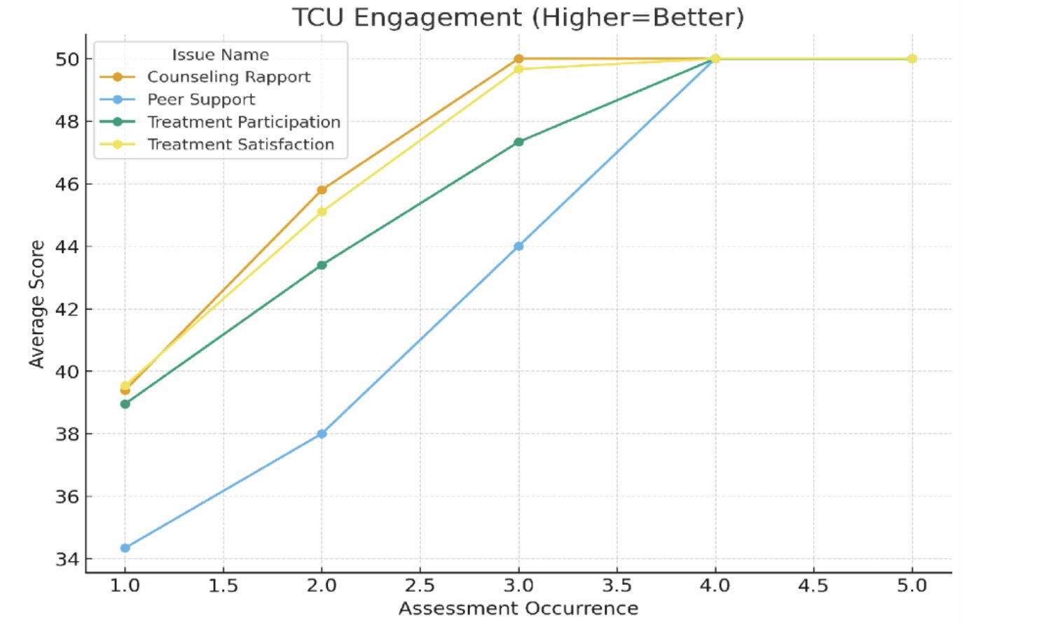 The table below shows the four scales used in measuring engagement, taken over five separate assessments (during Q2 of 2025) of KBH clients in counseling for problem gambling.