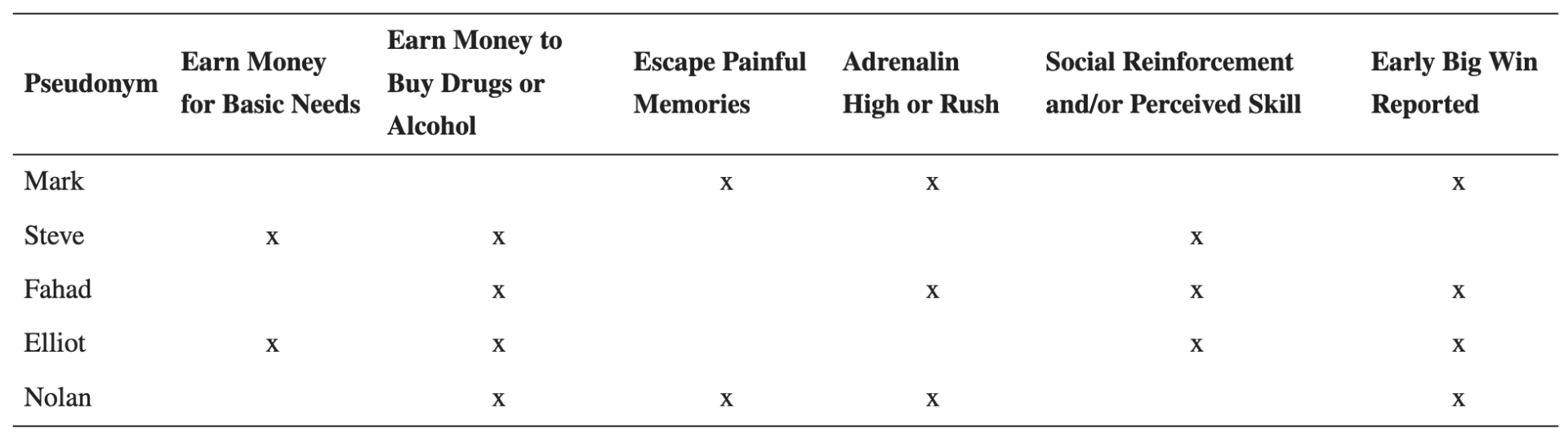 The same research referenced above (Gambling in the Landscape of Adversity in Youth) unveiled that earning money to cover basic necessities and buy drugs or alcohol were motivating factors to gamble.