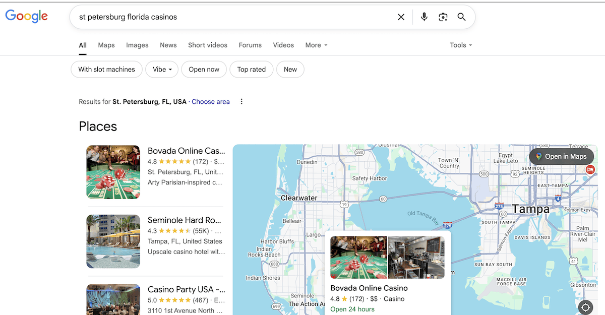 Some unregulated online gambling platforms are getting bold and creative in their strategies to infiltrate local populations. At press, a Google search for local casinos in St Petersburg, Florida, delivers the world’s most infamous unregulated online operator (click here to learn more) as if it was a land-based casino, which essentially tricks residents into thinking that it’s perfectly legal to use, even though online casinos are illegal in the county and state. The address this operator is using, is a for a hapless local business that may or may not be aware of what’s happening: