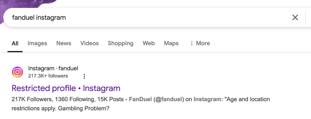 It’s no secret that gambling related marketing is found all over Meta properties, particularly Instagram which is well suited to the bells, whistles, and neon tones associated with casino and sports betting advertising. Celebrity gambling influencers are also ever-present on the platform, promoting a high-rolling lifestyle to all who follow, scroll, and pause along their respective feeds. This is the way of the social-digital world that Americans have become accustomed to, with the public trusting that policies and regulations will protect the vulnerable. In many cases such protections are indeed in place, as regulated operators such as DraftKings, FanDuel, BetMGM are doing their part not just to abide by Meta guidelines, but to play an active role in investing in player mental health support. Users located outside of the U.S. states with legal sports betting map are restricted from accessing their primary Instagram profiles. Further, regulated operators abide by Meta rules to place responsible gambling messaging at the forefront of their profiles, for example: