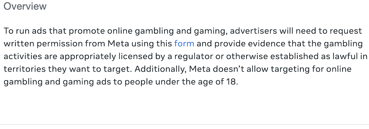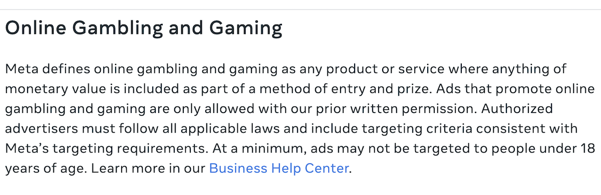 Below is a screen-grab taken directly from Meta’s Online Gambling and Gaming policy page: