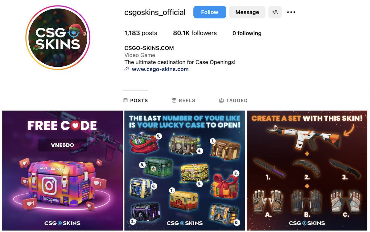 When users arrive at the @csgoskins_official website (below) they find a typical CSGO skins platform. Readers in-the-know already know what this means, but gambling policy watchdogs at Instagram may not. All they see is what appears to be an innocuous platform where gamers can buy, sell, and trade skins: