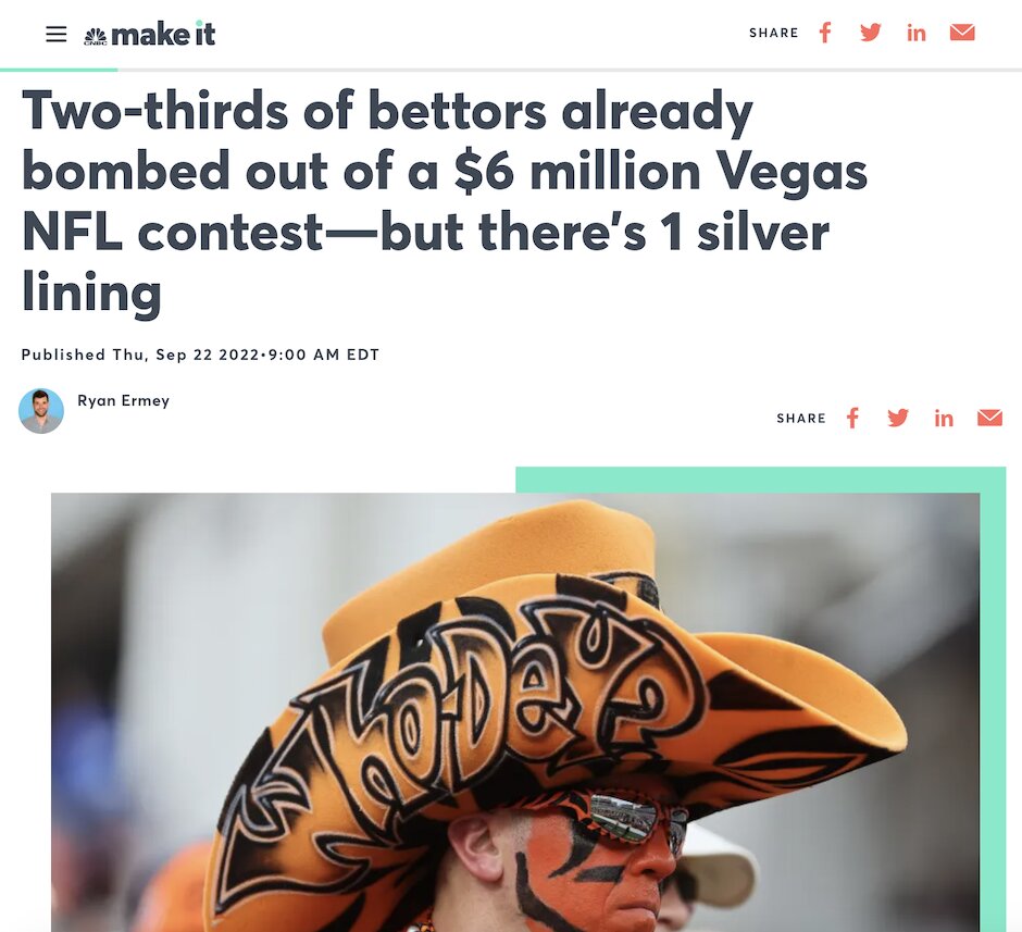This phenomenon has been occurring all football season long. Soon after the conclusion of NFL Week 1, CNBC’s Make It (which uses the tagline “Get smarter about how you earn, save and spend your money…”) published this headline: