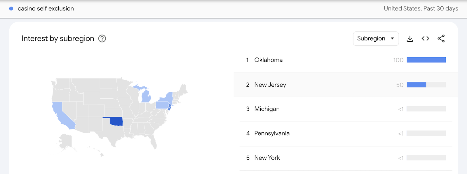 Standout: Our analysts identified that the online search expression “casino self exclusion” (and semantically related terms) is currently trending with great significance in Oklahoma. Online search for information on how to use casino self exclusion resources is a key indicator that the public is struggling to gamble responsibly. It’s important to note that self-exclusion alone is generally not enough to abstain from easily accessible online gaming (view details). Further, Oklahoma’s struggle with responsible casino gaming should be factored into the Sooner State’s next vote about whether or not to allow sports betting. People who struggle with problematic casino gaming are more likely (when compared to the general population) to struggle with sports betting.