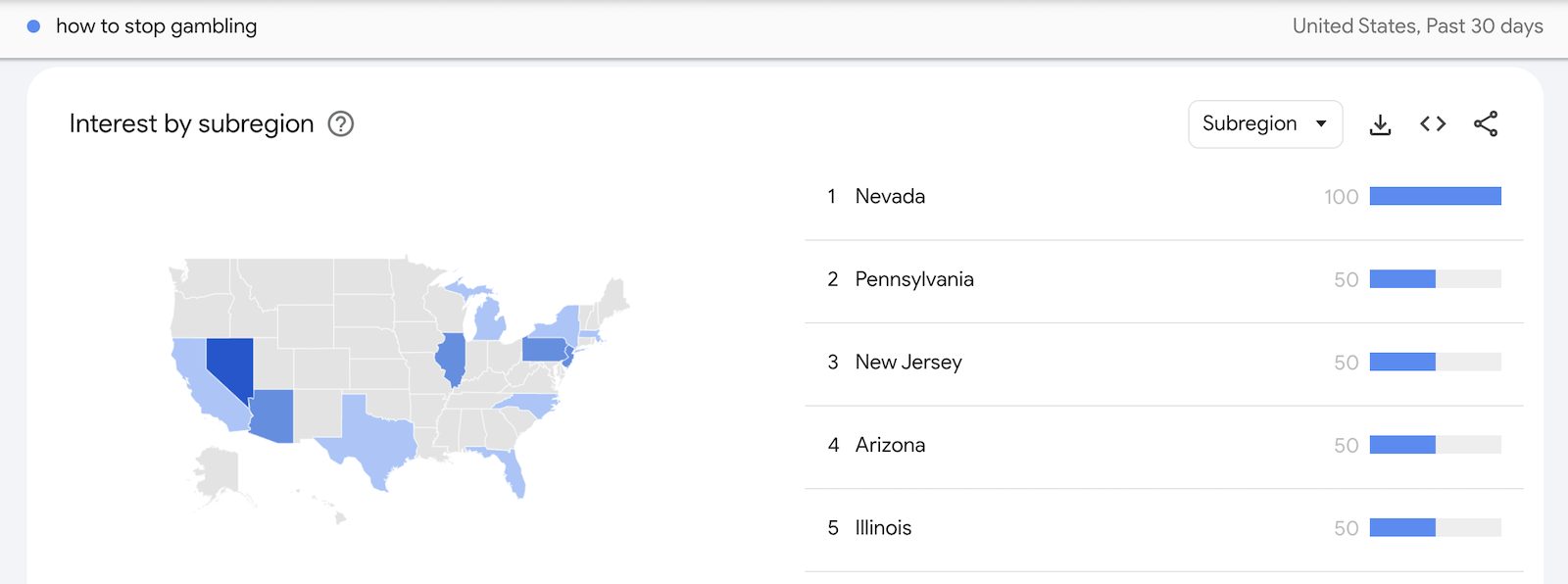 Standout: The online search expression “how to stop gambling” (and semantically related terms) is currently trending with great significance in Nevada. Given that the state has the most relaxed regulations regarding casino gaming and sports betting, this statistic comes as little surprise. New Jersey’s inclusion is also expected. What is notable, however, is the arrival of Pennsylvania, Arizona, and Illinois in trending search for public outreach for how to stop gambling.