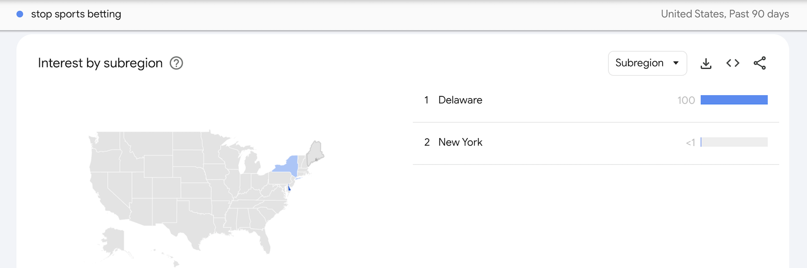 Standout: Our analysts identified that the online search expression “stop sports betting” (and semantically related terms) is currently trending in Delaware. This coincides with a recent GamingIntelligence report which unveiled that over the most recently reported month, Delaware saw an 88% year-over-year increase in online betting.