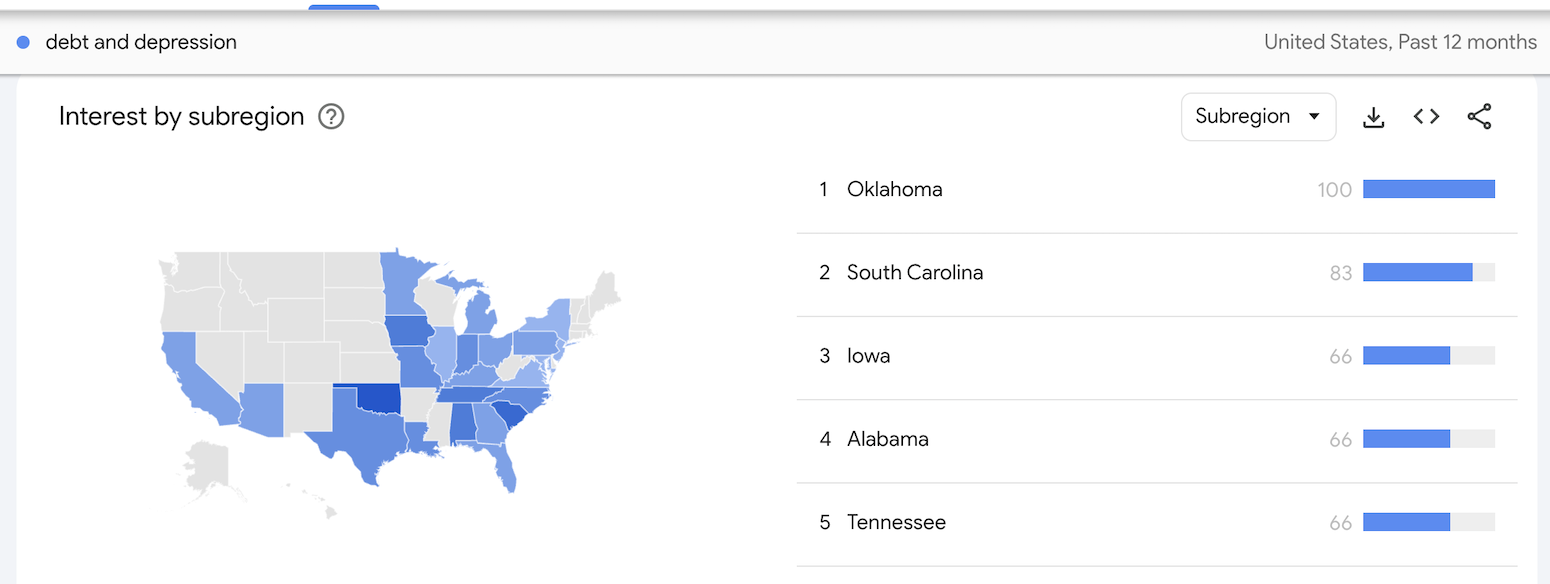 According to this data, Oklahomans lead the country in online search for semantics related to debt and depression, followed by South Carolinians, Iowans, Alabamans, and Tennesseans.