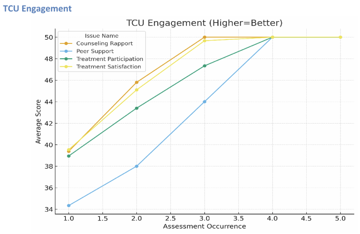 Kindbridge uses TCU Treatment Engagement Data as a key component of measuring client outcomes. The TCU Treatment Engagement Form (ENGForm) is a self-report assessment to measure client engagement. It consists of three-dozen items across four scales, including the following: