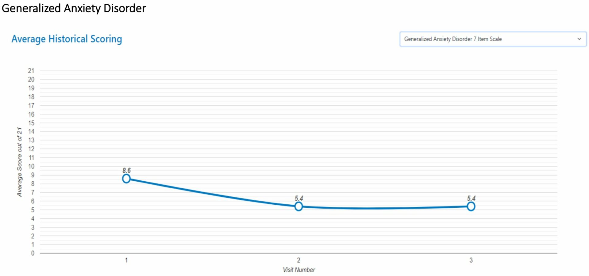 The initial decrease represents a positive response to treatment or intervention, with subsequent stabilization suggesting that the improvement was maintained over time. The consistent scores between the second and third visits could indicate that the treatment has been effective in managing anxiety symptoms. This example of an integrated treatment approach to addressing mental health issues experienced by active and veteran servicepersons can lead the way for a healthier U.S. military.
