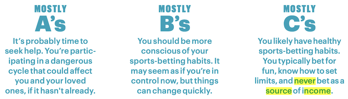 As a part of the Men’s Health nationwide survey referenced above, they created a quiz with problem gambling experts Marc Lekowitz, ICGCII, and Timothy Fong, M.D. Respondents were categorized as A’s, B’s and C’s based upon the multiple choice answers they provided. Those who didn’t consider sports betting as a means of income were least likely to have a problem with sports betting.